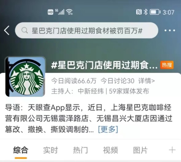 近日,一则#星巴克门店使用过期食品被罚百万#的消息冲上微博热搜。微博截图据中国消费者报微信公众号消息,近日,上海星巴克咖啡经营有限公司无锡震泽路店、无锡昌兴大厦店因通过篡改、撤换、撕毁调制的食品原料保质期标签等方式,使用过期食品原料、经营过期食品;擦拭食…